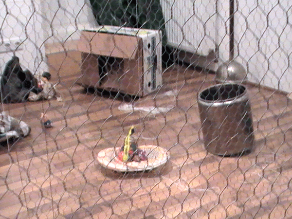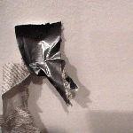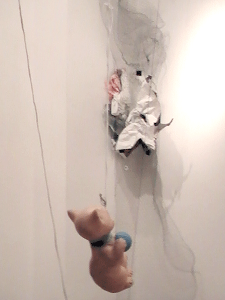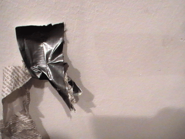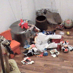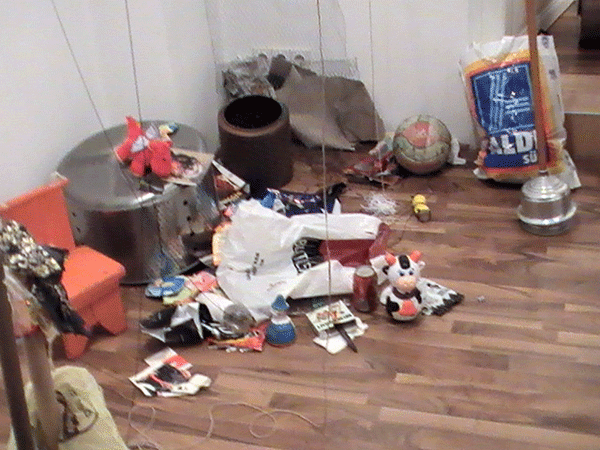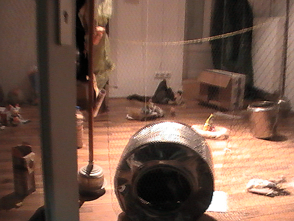 Ausgehend vom vorausgegangenen Projekt "Der Tempel", war auch hier Abfall und Konsumschrott das Arbeitsmaterial.Hier bei HOMELAB TESTTUBE INSTALL 2.0 lebte und bewohnte ich 10 Tage eine anfangs leere Galerie, also einen schon ,kunstvorbelasteten Ort'. Ich diente den Wänden als Mittler, Medium und Sprachrohr. Ich hörte ihnen zu, suchte raumrythmisch relevante, belast- und bespielbare Raumorte, durch an der Decke ausgependelt, Akupunktionsnadeln ähnlich angebrachten Schnüren, die bis zum Boden reichten und mir hier Projektionsflächen für die Objektinstallation zeigten.